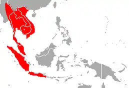 Країни проживання: Індонезія (Ява, Суматра), Лаос, Малайзія (півострів Малайзія), М'янма, Таїланд, В'єтнам. Мешканець деградованих і первинних листяних лісів.