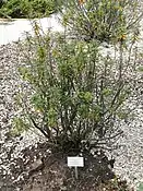 Кущ 0.2–1.5 м; кореневищний. Стебла прямі і / або розпростерті; кора гладка, іноді відлущується або крається з віком; гілочки одноклітинно-волосаті й із залозистими лусочками, лусочки часто вкриті густими, залозистими, нерозгалуженими, багатоклітинними волосками. Листя стійке, (запашне при подрібненні): черешок з лусочками й іноді залозистими багатоклітинними волосками; листові пластини яйцювато-ланцетні, іноді вузько еліптичні до лінійних, 2–5 × 1.5–2.5 см, шкірясті, поля цілі й голі, верхівка гостра, нижня поверхня з від розріджених до щільних лусочками, лусочки часто вкриті густими волосками; верхня поверхня з розкиданими лусочками, а іноді й волосками.