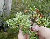 Розгалужений, розпростертий або піднятий кущ 0.2–0.45(1) м висотою; кореневищний. Черешок 1.5–4 мм, лускатий; листова пластина довгасто-еліптична, яйцеподібно-еліптична до довгасто-зворотнояйцеподібної, 0.4–1.5(2.5) × 0.2–0.5(0.9) см; основа широко клиноподібна; верхівка тупа або округла; нижня поверхня листа від жовтувато-брунатної до червонувато-коричневої, луски сусідні або перекриваються, 2-кольорові, блідо-коричневі або залозисті; верхня поверхня листа блідо-зелена, матова, щільно луската.
