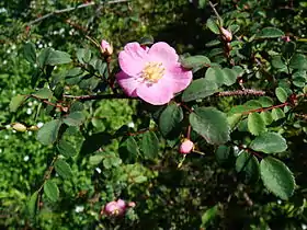 Кущ 1–2 м заввишки. Гілочки стрункі; щетина щільна; колючки рідкісні. Листки включно з ніжками 3–5 см; прилистки переважно прилягають до ніжки; листочків 7–9(11), яйцюваті або еліптичні, 5–18 × 3–10 мм, голі або знизу запушені вздовж жилок; основи клиноподібні або округло-тупі або гострі. Квітка поодинока, пазушна, 1.5–2 см у діаметрі; квітконіжка 1–2.6 см, гола, залозиста чи ні; приквітки відсутні, рідко присутні. Чашолистків 5, яйцювато-ланцетні. Пелюстків 5, рожеві, рожевуваті або білі, обернено-яйцюваті або довгасті, верхівка виїмчаста. Плоди насичено-червоні, еліпсоїдні або яйцювато-довгасті, 8–12 мм у діаметрі, з короткою шийкою на верхівці та стійкими чашолистками[1].