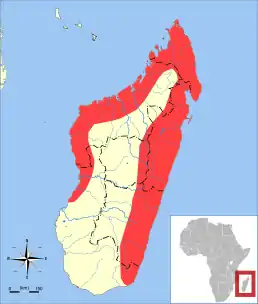 Ендемік Мадагаскару. Утворює колонії в сотні й тисячі осіб. Лаштує сідала в печерах. Харчується фруктами та нектаром.