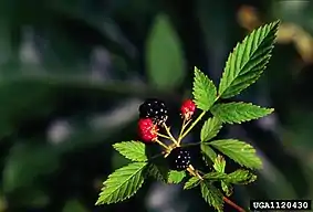 Це кущ до 3 метрів заввишки, озброєний. Стебла дворічні (йдуть від дерев'янистого кореневища), зазвичай повзучі, іноді низько-дугоподібні, а потім повзучі, квітучі гілки зазвичай прямовисні, безволосі або густо волосисті, не залозисті чи рідко залозисті; колючки від рідкісних до щільних, гачкові, іноді дистально тонкі, 1–4 мм, широкі. У перший рік на стеблах тільки листки, у другий рік з'являються квіти й вони відмирають після плодоношення. Листки опадні, іноді напівстійкі, трійчасті чи пальчасто складні, не блискучі; листочків 3–5, кінцеві від яйцеподібних чи еліптичних до субкруглих, 3–11 × 2–7.5 см, основа широко клиноподібна чи заокруглена до мілко серцеподібної, зазвичай нелопатева, краї від помірно до грубо пилчасті до подвійно пилчастих чи зубчастих, верхівка гостра або загострена до коротко ослабленої, нижня поверхня часто з колючками на середній жилці або неозброєна, рідко або помірно волосиста, не залозиста уздовж найбільших жилок. Суцвіття кінцеві, 1–3(8)-квіткові, китицеподібні. Квітки двостатеві; пелюстки білі, еліптичні, зворотно-яйцюваті чи зворотно-ланцетні, 8–20 мм. Плодичорні, іноді темно-червоні, кулясті чи циліндричні, 1–2 см; кістяночок 10–40. 2n = 14, 21, 28, 35, 42, 49, 56, 63. Період цвітіння: березень — червень[1][2].