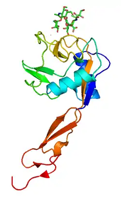 Задіяний у такому біологічному процесі як клітинна адгезія. Білок має сайт для зв'язування з лектинами. Локалізований у мембрані.