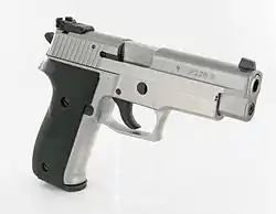 Найбільше компанія SIG Sauer відома своєю серією самозарядних пістолетів, родоначальником якої стала модель P220. Всі ці пістолети мали однакову конструкцію, з коротким ходом ствола і запиранням затвора масивним виступом в казенній частині ствола. Відпирання затвора відбувається при взаємодії фігурного пазу, який розташований в нижньому виступі казенної частини ствола, з нерухомим штифтом в рамці, що призводить до опускання казенної частини ствола і виходу виступу із вікна для екстракції (модифікована система Браунінга).