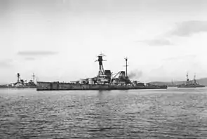 | «Гінденбург» (в центрі) и «Дерфлінгер» (ліворуч позаду) в Скапа-Флоу, 1919 рік | ||