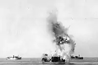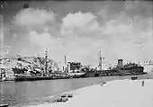 | Американський танкер SS «Огайо», важко пошкоджений за підтримки британських есмінців входить до Великої гавані. Операція «П'єдестал». 15 серпня 1942 року | ||