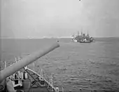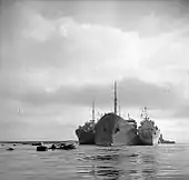 Пошкоджений американський танкер SS Ohio за підтримки есмінців (ліворуч — есмінець HMS «Пенн», праворуч — HMS «Ледбарі») наближається до берегів Мальти |