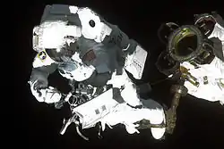 Під час польоту було здійснено три виходи у відкритий космос.