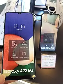 ![]() Samsung Galaxy A22 5G на передньому плані та Samsung Galaxy A12 на задньому | |
