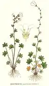Суцвіття 2(5)-квіті, іноді поодинокі квіти, квіти пониклі в пуп'янку. Квіти: чашолистки прямостійні, (іноді червонуваті), довгасті, краї залозисто-війчасті, поверхні з коротко-залозисті; пелюстки білі, без плям, від зворотнояйцеподібних до лопатчатих, 5–12 мм, довші за чашолистки; тичинки 4–5.5 мм. Плід — коробочка, що містить численне насіння. S. cernua є поліплоїдною з різним числом хромосом в діапазоні 2n = 24–72.