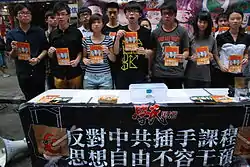 Молоді члени «Scholarism» розпочинали окупаційний протест в урядовому штабі Гонконгу, щоб змусити уряд відмовитися від своїх планів з впровадження "моральної і національної освіти" (про-комуністичної пропаганди), як обов'язкового предмета в період з серпня і вересні 2012 року. П'ятдесят молодих членів зайняли громадський парк під урядовою установою, три з яких оголосили про голодування[5]. Деякі вважають, що члени спільноти користуються своїм малим віком, щоб мати додаткову протидію насиллю та захист від поліції, яка могла б вже давно бути застосована проти дорослих.
