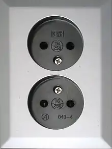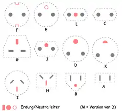 - Данія (поточний стандарт, 107-2-D1, приймає вилки CEE 7/7, але без підключення заземлення. Французький стандарт набрав чинності з 1 липня 2008 року, але він не встиг сильно поширитися),