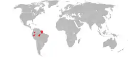Цей вид зустрічається в чотирьох основних роз'єднаних популяціях в Перу і Колумбії, центральній частині північної Бразилії і північному сході Бразилії, в Французької Гвіани, Суринамі й Гаяні. Уподобання середовища проживання і екології цього виду невідомі.