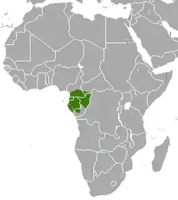Вид поширений в Камеруні, Республіці Конго, Габоні. Його природним середовищем проживання є субтропічні або тропічні сухі ліси.
