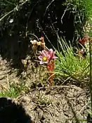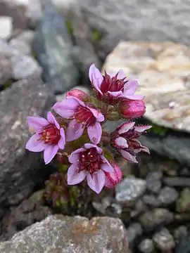 Дворічна, рідко однорічна або багаторічна, багатостовбурна від основи й залозисто-волохата рослина заввишки 5–15(20) см. Є базальні розетки. Листки чергові, сидячі, пластини горохово-зелені, не тьмяні, від еліптично-довгастих до лінійних, 3–8 × 1.4–1.9 мм, верхівки тупі. Квітучі пагони прямостійні, прості або гіллясті від основи, 2–10 см. Суцвіття 3–10-квіткові, 2–3-розгалужені; гілки не загнуті. Чашолистки прямостійні, виразні, зелені строкаті з червоним або темно-фіолетовим, ланцетні або яйцевидно-еліптичні, рівні, 2–4 × 1–1.5 мм, тупі верхівки, (залозисто опушені). Пелюстки виразні, рожево-червоні з темними серединними жилками, еліптично-яйцеподібні, 3–4.5 мм, верхівки гострі, (рідко залозисто опушені). Пиляки червоні. Плодолистки чіткі, яскраві жовтувато-зелені, перетворюючись на темні винно-червоні.