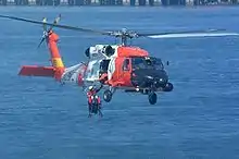 ![]() Завислий HH-60J Jayhawk опускає плавця-рятувальника у воду під час демонстрації | |