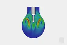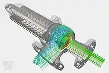 ![]() Залучає потоки текучого середовища, які залежать від твердого руху тіла - загальний приклад потоку змінений відкриттями і закриттям клапана скидання тиску. Моделювання проводилося з використанням SimScale. Аналіз Запобіжний клапан.[24] |