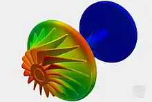 ![]() Гармонійний аналіз може показати піковий відгук системи при навантаженні в заданому діапазоні частот. Зображення показує контурний графік переміщень. Моделювання проводилося з використанням програмного забезпечення SimScale FEM. Проект: Гармонійний аналіз крильчатки.[17] |