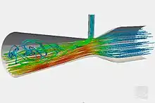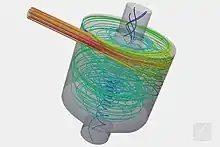 ![]() Грубі потоки, які, як правило, відбуваються, коли швидкість перетинає поріг - приклад буде турбулентний потік рідини в циклонний сепаратор. Проект: Турбулентний потік рідини в циклонний сепаратор.[21] |