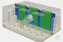 ![]() Гладкий потік, який має місце при малих швидкостях - зображення показує ламінарний потік текучого середовища в чистому приміщенні. Аналіз проводився з використанням компонента CFD платформи SimScale. Проект: ламінарний потік рідини в чистому приміщенні.[20] |