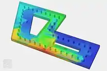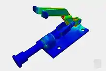 ![]() This image shows a nonlinear static analysis of a snap-fit. The analysis incorporates a complex physical contact behavior between the two components. The analysis is done on SimScale. Project: Contact analysis of a consumer snap fit.[13] |
