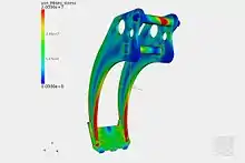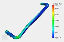![]() Linear static analysis calculates displacements and stresses resulting from the applied load. The image describes the contour plot of stresses obtained from linear static analysis of a gripper arm. Project: Static structural analysis of a gripper arm.[12] |