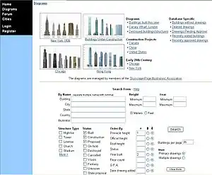 Діаграми SkyscraperPage — унікальне зібрання зображень будівель у строгому масштабі — в 1 пікселі 1 метр. Відділення діаграм було створено у 1997 р. Нині сайт містить більш 40700 повнокольорових зображень майже 29900 будинків і споруд (лютий 2012).[4] Користувачі сайту можуть вишукувати споруди по черзі за видом, станом, розташуванню, висоті, рокам побудови й іншими критеріями у програмі пошуку. Кожний, ставши членом міжнародної асоціації ілюстраторів SkyscraperPage (SSPIA), може намалювати зображення будови за певними правилами, яке потім буде затверджено старшим комітетом редакторів сайту. Діаграми SkyscraperPage, як наглядний посібник про висотні будови, публікуються у багатьох авторітетних газетах і журналах світу. Крім того, сайт продає власні плакати.