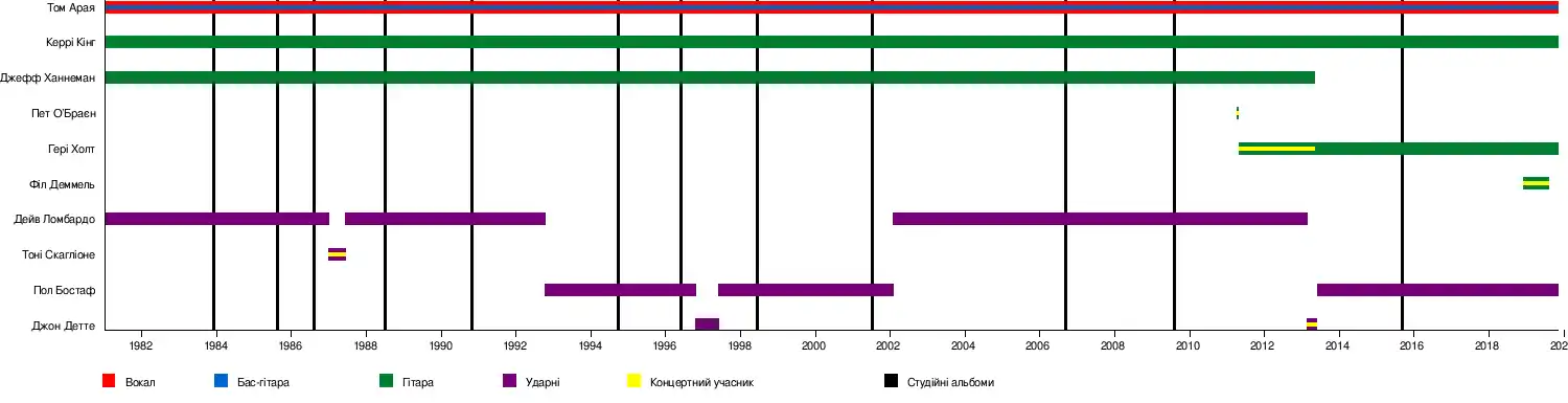 Того дня два музиканти розговорилися, а коли Джефф зіграв уривки композицій Iron Maiden та Judas Priest, Керрі здивувався та запропонував створити власний гурт[3]. На місце бас-гітариста дует запросив Тома Арая, який до того грав разом з Кінгом в іншому колективі. Барабанщика Дейва Ломбардо було запрошено до гурту після того, як під час виконання одного з замовлень (він працював у піцерії) той зустрівся з Керрі Кінгом, який розповів йому, що грає на гітарі[4].