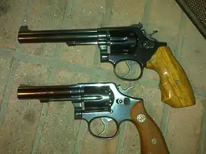 ![]() Smith & Wesson Модель 14-4 зі стволом 6 дюймів (згори) та Smith & Wesson Модель 10-6 за стволом 4 дюйми (знизу) | |