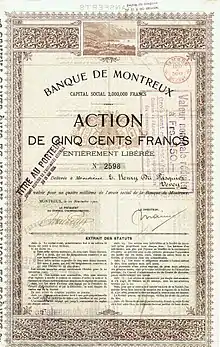 Акція Société anonyme Banque de Montreux, 1900