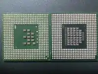 | Адаптер Asus CT-479 | Порівняння процесорів Dothan (Pentium M SL7SM) (зліва) та Yonah (Core Duo) (зправа). Обидва ціпи мають 478 контактів, однак, їхнє розташування різниться. |