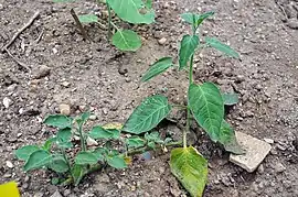 Трав'яниста рослина або напівчагарник висотою до 1 м. Стебла ростуть вертикально, мають діаметр ≈5 мм, порожнисті, зеленого кольору і щільно покриті ≈0.5 мм завдовжки, залозистими трихомами. Листя довжиною від 4 до 8 см і шириною від 2 до 9 см. Вони 3-лопастні, іноді утворюється лише одна базальна частка, особливо у верхній частині рослини, або листя цілісне. Верхня і нижня поверхні листків щільно залозисто-волохаті. Черешки довжиною від 1.5 до 5 см і густо залозисті волосаті.