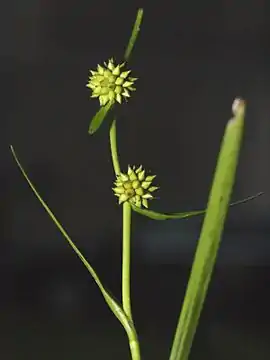 Трав'янистий багаторічник. Стебла тонкі, як правило, плавучі, до 60 см. Листя зазвичай плаває, ледь підвищене біля основи, плоске, 0.04–0.6 м × 2–6 мм. Суцвіття просте, голови сидячі або стеблові, 0.5–1.2 см діам. Плоди еліпсоїдальні-оберненояйцевидні, від звужених на кінці до з дзьобом, темно-зелені або коричневі, майже сидячі, 1.3–2.5 × 0.9–2 мм. Насіння 1. 2n=30.