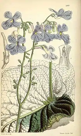 Рослина формує розетку з волохатих листків до 45 см. Блідо сині трубчасті квіти з'являються на квітконіжках висотою 25 см. По краю пелюсток поцятковано пурпурним кольором. Плід коробочка, що розкривається як пружина при дозріванні.