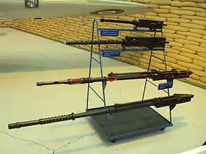 ![]() Озброєння, що в різний час встановлювалося на Спітфайр. Зверху кулемети Браунінг калібрів 7,69 і 12,7 мм, знизу 20-мм гармати Іспано-Сюіза. |