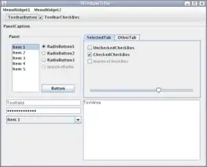 Наступний код демонструє основи використання Swing. Ця програма зображує вікно (JFrame), у вікні міститиметься кнопка з написом «Натисніть сюди» на ній та написом праворуч «Ця кнопка не робить нічого:».