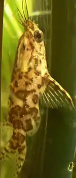 Тіло коренасте, дещо сплющене по боках. Профіль черевця вигнутий менше за профіль спини. Очі великі. Рот нижній із трьома парами вус. Хвостовий плавець дволопастний. Спинний плавець трикутної форми та має потужний перший промінь. Наявний великий жировий плавець. Забарвлення сірувато-бежеве з розкиданими по тілу і плавцях чорно-коричневими плямами. Черевце темніше за спину. Статевий диморфізм виражений слабко: тіло самки у більших плямах, самець дрібніший та стрункіший за самку (самці виростають до 6 см завдовжки, самки — до 9,5 см).