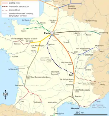 - LGV Sud-Est: Париж — Ліон; з 1983; довжина 538 км;