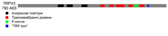 TRPV3 — мономерний білок з родини іонних каналів TRP, гомо- та гетеротетрамерні комплекси якого формують рецептор-керований низькоселективний канал.