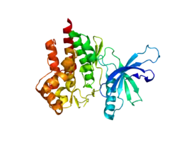 TYK2 (англ. Tyrosine kinase 2) – білок, який кодується однойменним геном, розташованим у людей на короткому плечі 19-ї хромосоми.[5] Довжина поліпептидного ланцюга білка становить 1 187 амінокислот, а молекулярна маса — 133 650[6].