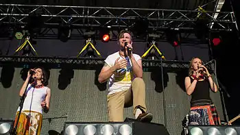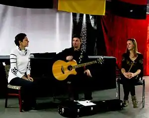 ![]() Три учасники гурту «TaRuta» виступають на вечорі повстанської пісні в НаУКМА. Зліва на право: Олена Романенко, Євген Романенко, Ярина Товкайло | |