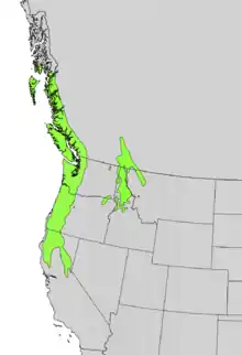 Країни проживання: Канада (Альберта, Британська Колумбія); США (Аляска, Айдахо, Монтана, Невада, Орегон, Вашингтон). У прибережних районах це дуже вогнесприйнятливий і повільнорослий вид, як правило, зустрічається у вигляді невеликого дерева; у гірських та деяких внутрішніх районах це може бути чагарник, що стелиться. Найпоширеніший у старих хвойних лісах. Росте разом з Abies grandis, Tsuga heterophylla, Thuja plicata, Berberis nervosa, Polystichum munitum, Acer circinatum. Далі від узбережжя і у більш сухих частинах ареалу обмежений вологими областями, такими як береги струмків. Довжина покоління, ймовірно, понад 30 років. Записаний від рівня моря до 2440 м.