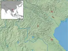 Мешкає в Лаосі, В'єтнамі і Таїланді. Пов'язаний, ймовірно, з пагорбами і з гірськими районами в первинних і помірно порушених лісах.