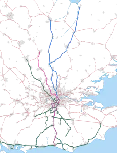 | Початкова чи кінцева точка | Brighton railway stationd, Sutton railway stationd, Sevenoaks railway stationd, Bedford railway stationd, Luton railway stationd і St Albans City railway stationd |