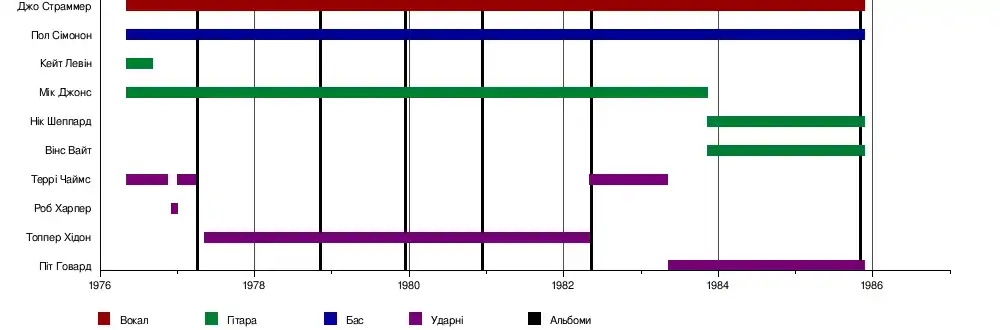 Мік Джонс | Травень 1976 — Вересень 1983 | Гітара, вокал | Всі релізи The Clash, крім Cut the Crap (1985) |
