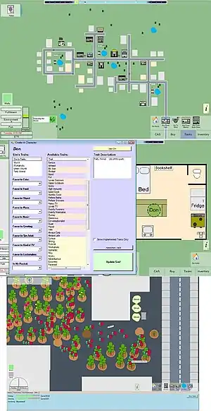 При роботі над базовим ігровим процесом та поведінкою сімів в умовах відкритого світу, були використані двомірні моделі персонажів і будівель без анімації, для швидшої роботи з комп'ютерами та економії часу. Розробники займалися водночас кількома різними моделями поведінки персонажів, більшість з яких, зрештою, не виправдали себе і стали причиною виникнення кумедних або навіть тупикових сценаріїв, пов'язаних зі взаємовідносинами персонажів, деякі прототипи не «доживали і двох днів». Наприклад, одна з головних проблем полягала у «ефекті натовпу», щоб персонажі, у великих кількостях, могли правильно переміщатися по тротуару і пропускати один одного, проте за словами Рода Хамбла, завдяки роботі над подібними помилками і недоліками, розробникам вдалося удосконалити прототип геймлею та усунути безліч недоліків, які з першого погляду неможливо було б помітити. Наприклад ,виникнення ситуації, коли персонаж відсутній на роботі, а його неприбрана книга лежить на підлозі, що неодмінно почне дратувати гравця, оскільки він захоче прибрати її без допомоги персонажа. У результаті в гру було вирішено впровадити інструмент «живого переміщення», що дозволяє за допомогою захоплення мишкою перетягувати деякі об'єкти в режимі життя, наприклад, переміщати стару газету в сміттєвий бак, не задіявши при цьому сіма.