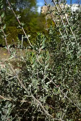 Напівчагарник 25–45 см, піднятий. Листки черешкові, 4–8 × 1–3 мм, еліптичні, волохаті. Суцвіття 8–9 мм, сферичні. Приквітки 3.5–4 × 2–3.5 мм, широко яйцеподібні, війчасті. Чашечка 2.5–3.5 мм, з верхніми зубцями ≈1 мм і нижніми ≈1.5 мм. Вінчик ≈3.5 мм, трохи виступає з чашечки, кремового кольору. Горішки 0.7–1.2 мм, еліпсоїдні. 2n = 30[2].