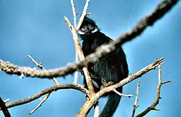 Довжина голови і тіла самців: 55-64 см, самиць: 47-59 см; довжина хвоста самців: 82-96 см, самиць: 74-89 см; вага самців: 6,5-7,2 кг, самиць: 5,5-5,9 кг; вага при народженні: 0,45-0,50 кг. Має високий і гострий гребінь чорного волосся на голові. Хутро чорне з білими лініями від кутів рота, по щоках до вух. Допитливе і миле лице має короткий писок і видні надбрівні дуги, даючи вираз постійного подиву. Не має защічних мішків, натомість є опуклий живіт, де повільно засвоюються продукти харчування. Є сідничні мозолі. Руки і ноги дуже тонкі з коротким пальцями. Хвіст довгий, прямий, чорний з білим кінчиком. Великі пальці добре розвинені, протиставні. Передні кінцівки набагато коротші, ніж задні з голими долонями і стопами, що дозволя легко схоплювати гілля. Хутро немовлят блідо-імбирно-оранжеве, обличчя і кінцівки чорні.