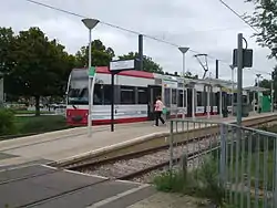На всіх трамвайних зупинках низькі, заввишки 350 мм над рівнем залізничного полотна, платформи, які розташовані на одному рівні з дверима вагонів. Це дозволяє людям на інвалідних візках і пасажирам з дитячими візочками безперешкодно зайняти місце у вагоні, а, завдяки відсутності сходинок, пасажирам не доводиться піднімати ногу і робити великий крок вперед, щоб зайти у трамвай, що особливо важливо для людей похилого віку. Платформи складають з тротуарами єдине ціле, тобто відсутні різні сходинки і бортові камені. На більшості з 39 станцій довжина платформи становить 32,2 м. Платформи мають ширину понад 2 м. Зупинки працюють без обслуговчого персоналу, вони обладнані автоматами з продажу квитків. Як правило, перехід з однієї платформи на іншу здійснюється залізничними настилами.