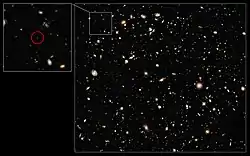 Досі найвіддаленішою галактикою вважалась IOK-1 із сузір'я Волосся Вероніки, червоний зсув якої дорівнював 6,96, навіддаленішим об'єктом — гамма-сплеск GRB 090423 (сузір'я Лева) із z = 8,2[5].